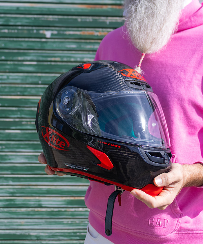 ミキさん:これは「Nolan X-lite」のカーボンヘルメットです。昔タイへ旅行に行ったとき、ノーヘルでバイクに乗っている人を見て衝撃を受けて、「バイクいいな」って思ったんです。日本に戻ってから免許を取って、ずっと憧れだったドゥカティに乗るために貯金をしました。このヘルメットとバイクを手に入れたときは、夢がひとつ叶った瞬間でしたね。
