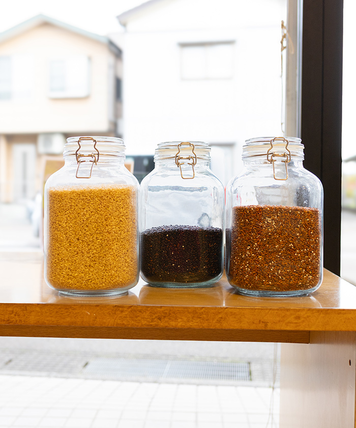 エレナさん:店の一角には、私たちがイチから育てたものを並べています。このガラス瓶に入っているのは、「はざかけ」にした3種類のお米や、イタリアの古代麦です。日本のスーパーはプラスチック包装が多いですが、うちはゴミを出さない「量り売り」のスタイルにこだわっていて。自分たちで工夫して形にするのが、私たちのスタイルですね。