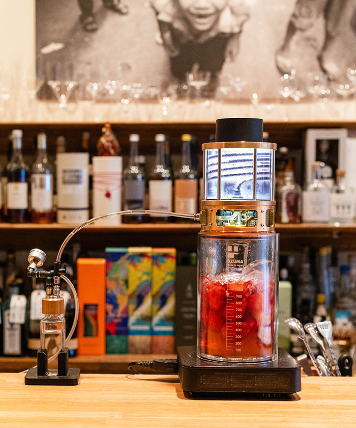 野歩さん:タンクの中に果物やハーブと水を入れて蒸留させて、食材の香りがついた蒸留水を作る機械です。減圧蒸留なので、40度から50度くらいで沸騰します。今回はいちごのモクテルに使う、イチゴの蒸留水を作っています。他の果物やハーブを入れて蒸留水を作ることもあります。
