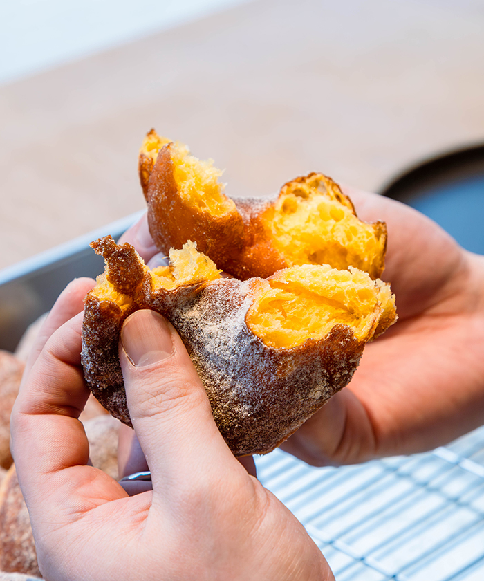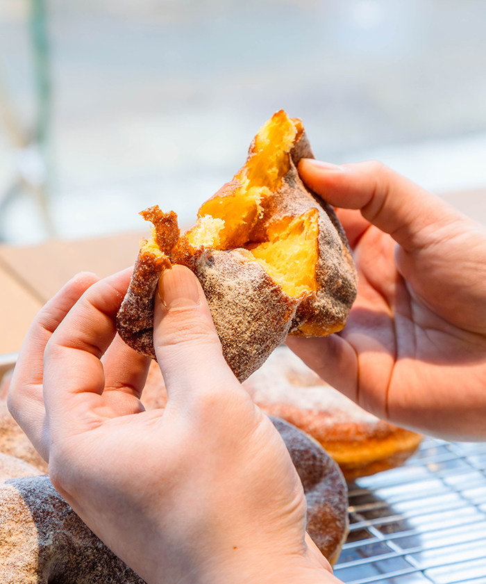 伊藤さん:いちばんスタンダードな「きび砂糖」は、まず食べてほしいですね。僕、小麦が熟成した香りと味がすごく好きで。「きび砂糖」も小麦の香りと味が楽しめるものになっていると思います。卵は「ツバメファーム」さんの新鮮な卵を使っていますし、ドーナツのみずみずしさも感じられる一番人気のドーナツです。そのまま食べてもいいし、食べる前に10秒くらい電子レンジで温めても美味しいですよ。
