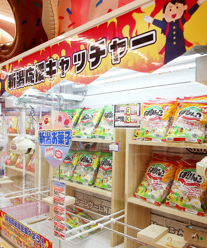 高橋さん:社長も私も地元愛が強いんです。2階には「新潟応援キャッチャー」をご用意して、越後製菓さんや三幸製菓さん、ブルボンさんといった地元メーカーのお菓子を景品に揃えています。