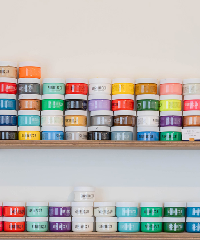 星山さん:「はじまり準備室」のオリジナルグッズみたいなのをつくりたいなって思っています。ここにインクをたくさん置いていますが、実際に印刷したときに、どんな色になるかってわかりにくいと思うんです。シルクスクリーンで印刷したオリジナルのグッズをつくれば、カラーサンプルにもなりますし、色の組み合わせ方も提案できるかなって。皆さんにシルクスクリーン印刷の楽しさを少しでも伝えられるように、いろんなことをやっていきたいです。
