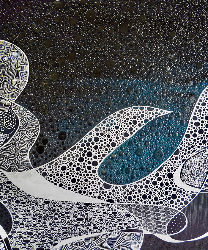 harumiさん:主にボールペンを使って表現している「ペン画」ですね。真っ白なボードを絵の具などで塗りつぶして、その上からボールペンで一つひとつ模様を描いていきます。