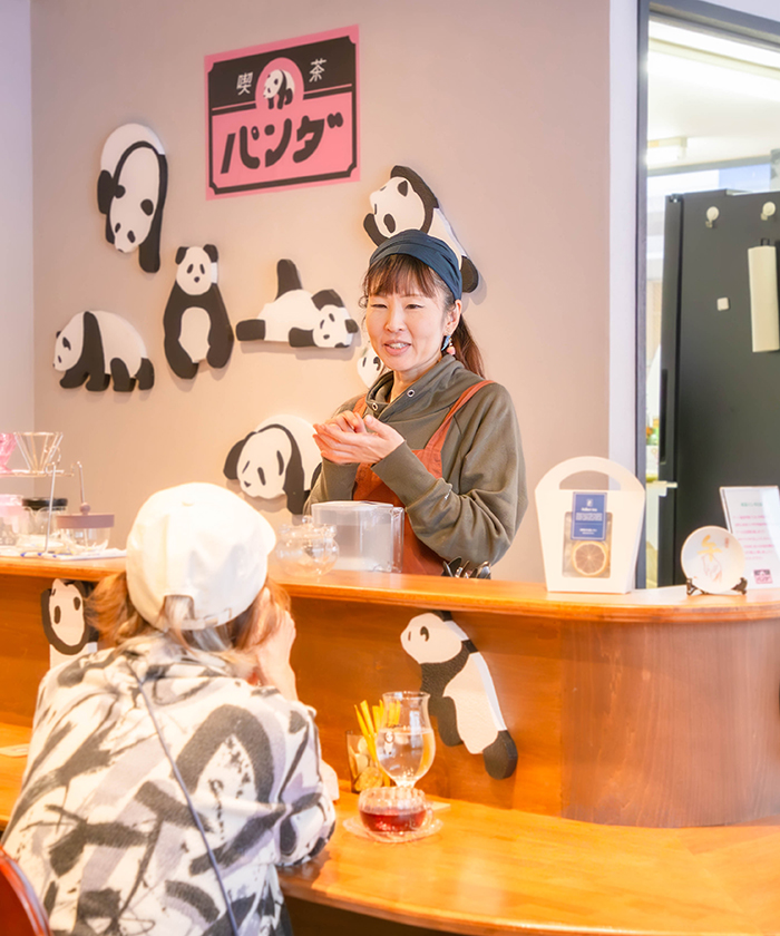 手部さん:古町で取り組んでいたアートプロジェクト「Rene challenge(ルネチャレンジ)」で、空き店舗のシャッターをパンダの大群で埋め尽くしたことがあって、とても評判が良かったんです。そのパンダが喫茶店をはじめたというストーリーになっていて、私は「パンダママ」という肩書きになっています(笑)