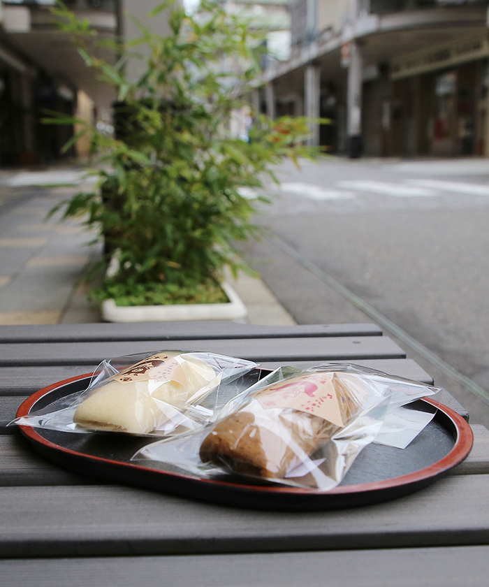 金巻さん:アーケードの改修工事が行われた際に、新しくなった上古町商店街を記念して発売されたのが「カミフルポッポ」です。歩きながら食べることができる、町歩きのお供として誕生しました。「きなこ」と「さつまいも」の二種類を定番としてご用意していますが、季節のよっては期間限定の「カミフルポッポ」もお楽しみいただけます。
