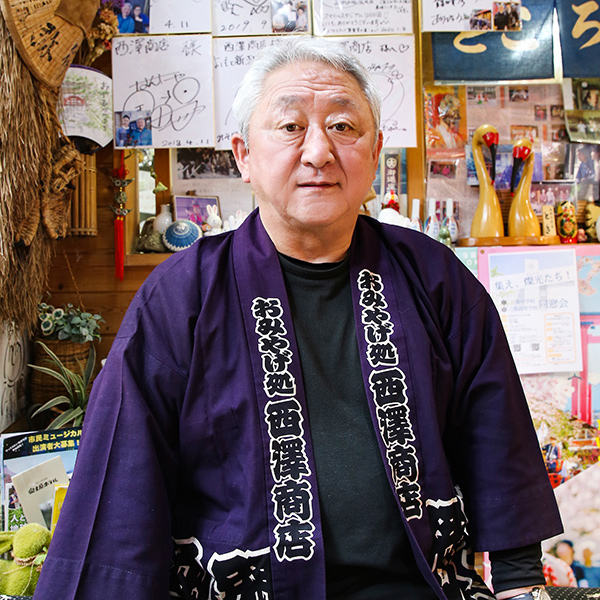 1958年加茂市生まれ。明治大学卒業後、自動車メーカーを経て、元大蔵大臣の秘書を14年務める。結婚を機に弥彦へ移住して「西澤商店」を受け継ぎ、弥彦村議会議員を3期務める。クラシック音楽鑑賞が趣味で、ステージで合唱やオペラ歌唱を披露した経験もある。彌彦観光ぼらんてぃあガイドの代表も務めている。