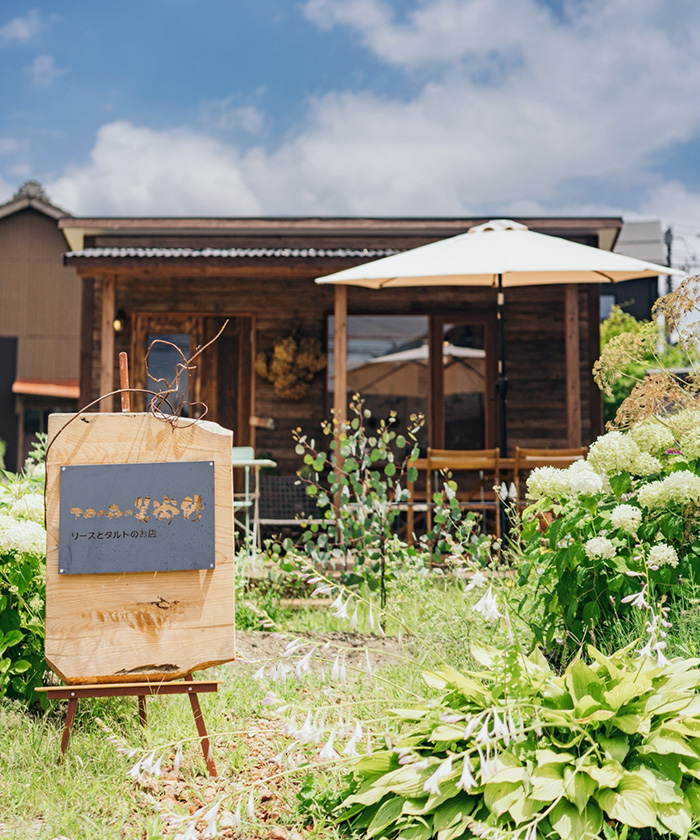内山さん:カフェにするか、テイクアウトのお店にするか、アイディアはいくつかあったんですけど、お誘いいただいたところに出向くのでスケジュールがいっぱいになってしまって。でも会場で「商品はどこで買えるんですか?」と聞かれることが度々あったので、三条市内にタルトのテイクアウトとリース販売のお店を作ることにしました。電気工事技術者の父と、建築業で頑張っている同級生に協力してもらい、廃材を活用して作った店舗です。