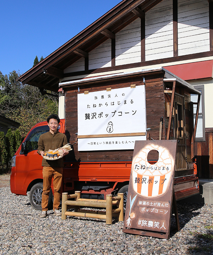 1988年加茂市生まれ。香川県のNGO団体で活動後、青年海外協力隊としてペルーに渡る。帰国後は五泉市役所で公務員として働き、2023年に「旅農笑人」を立ち上げて、農業を中心とした事業を展開している。2025年からは自作したキッチンカーで、自家栽培したトウモロコシでつくるポップコーンの販売をはじめた。