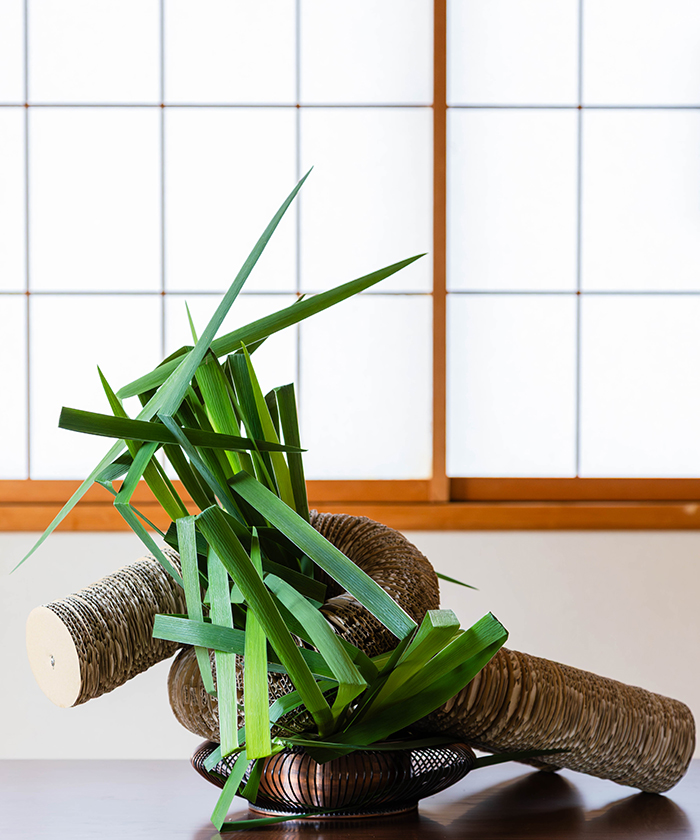 晶さん:あとは、いけている最中に発見したことは取り入れるようにもしています。段ボールを使ったこの作品は、最初は植物をまっすぐの状態のままいけていたんですけど、空間が微妙に空いていて、物足りなさがあったんです。だから、植物をちょっと折ってバランスが良くなるように収めてみました。空間を使っていけることも、いけばなの特徴のひとつだと思います。