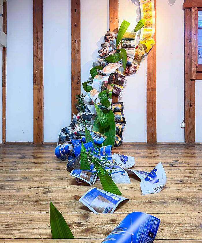 晶さん:段ボールも紙も元は植物からできているから、つながりがないわけではないと思うんです。以前「砂丘館」で展示した作品では、美術展のフライヤーを使ったこともあります。異素材を使って、いかに造形的に自分の表現ができるかは、まだまだ研究中なんですけどね。
