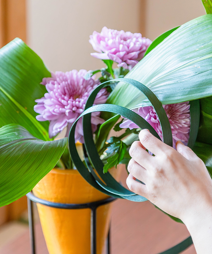 晶さん:それこそ、今日作った作品にはクラフトバンドを使っています。最初は植物に絡めて使おうと思ったんですけど、花器と植物の統一感が欲しくて、花器にもクラフトバンドを絡めてみました。自分の表現ができればそれでOKだと思うので、常識にとらわれず、いろいろ試しながら作品をつくるんですよ。